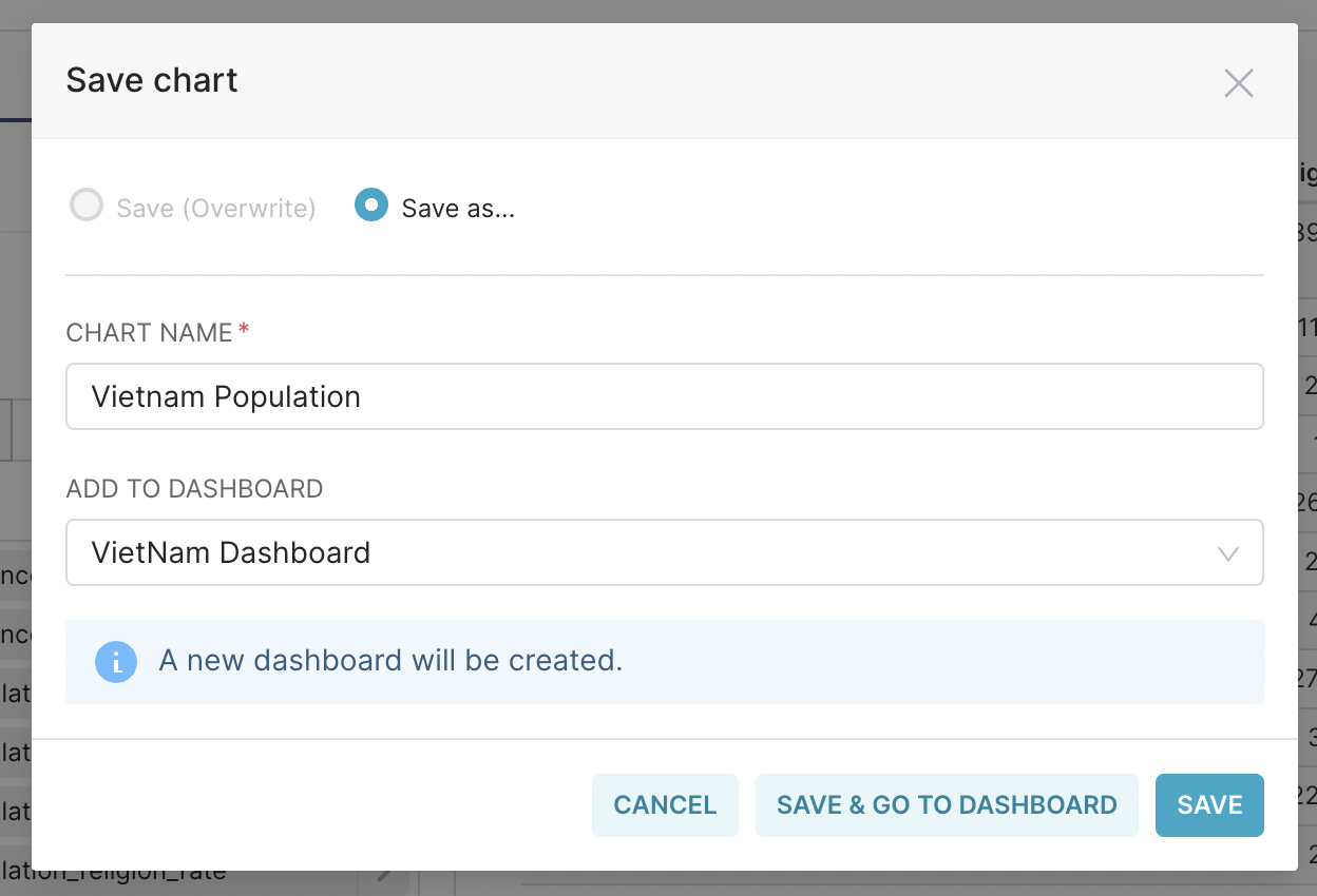 Cuối cùng nhấn Save, và chọn Dashboard bạn muốn hiển thị chart lên (nếu Dashboard chưa tồn tại, thì hệ thống sẽ tạo ra Dashboard và nhúng Chart vào). Nhấn Save & Go to Dashboard